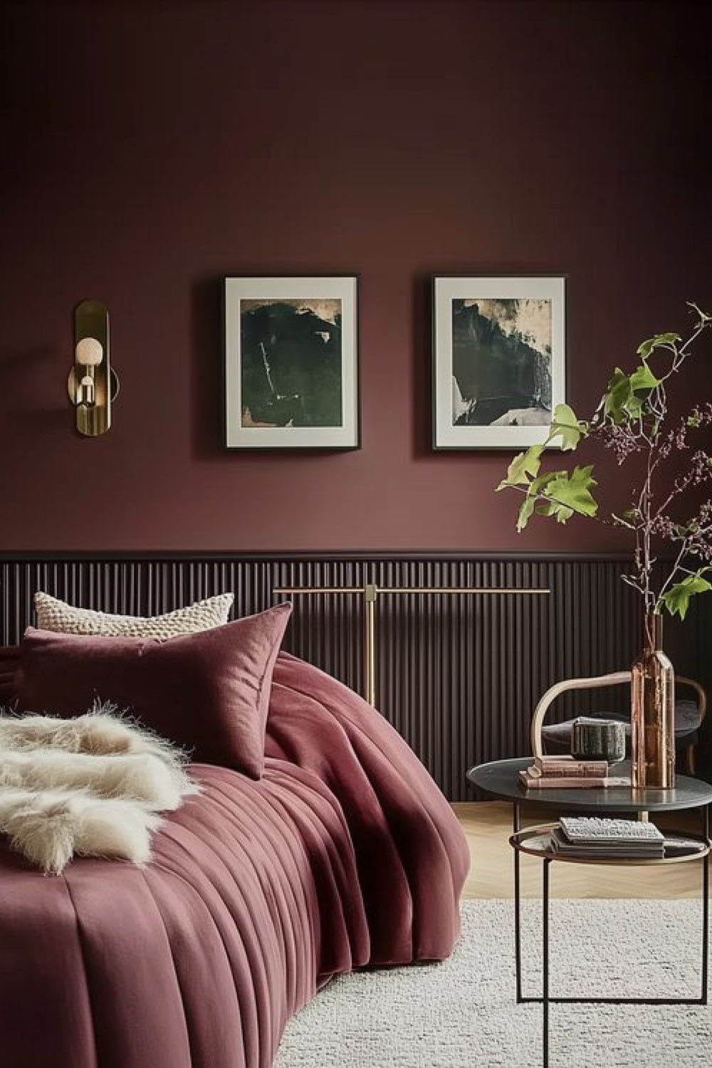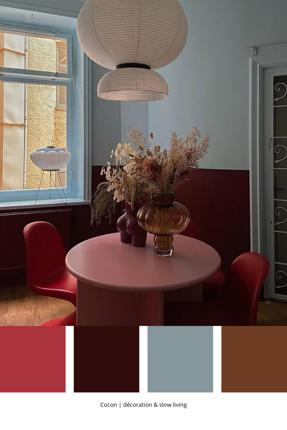 Nous sommes au milieu de cet article consacré à la couleur bordeaux. Je tenais à vous montrer que cette couleur pouvait aussi se trouver dans une pièce de vie moderne, contemporaine. On est sur une nuance de bordeaux un poil plus clair qui est utilisé en soubassement XXL et associée au mur avec un blanc lumineux. Le petit canapé design est rose. On est sur une forme de camaïeu, des couleurs pas si lointaines l'une de l'autres sur le cercle chromatique.