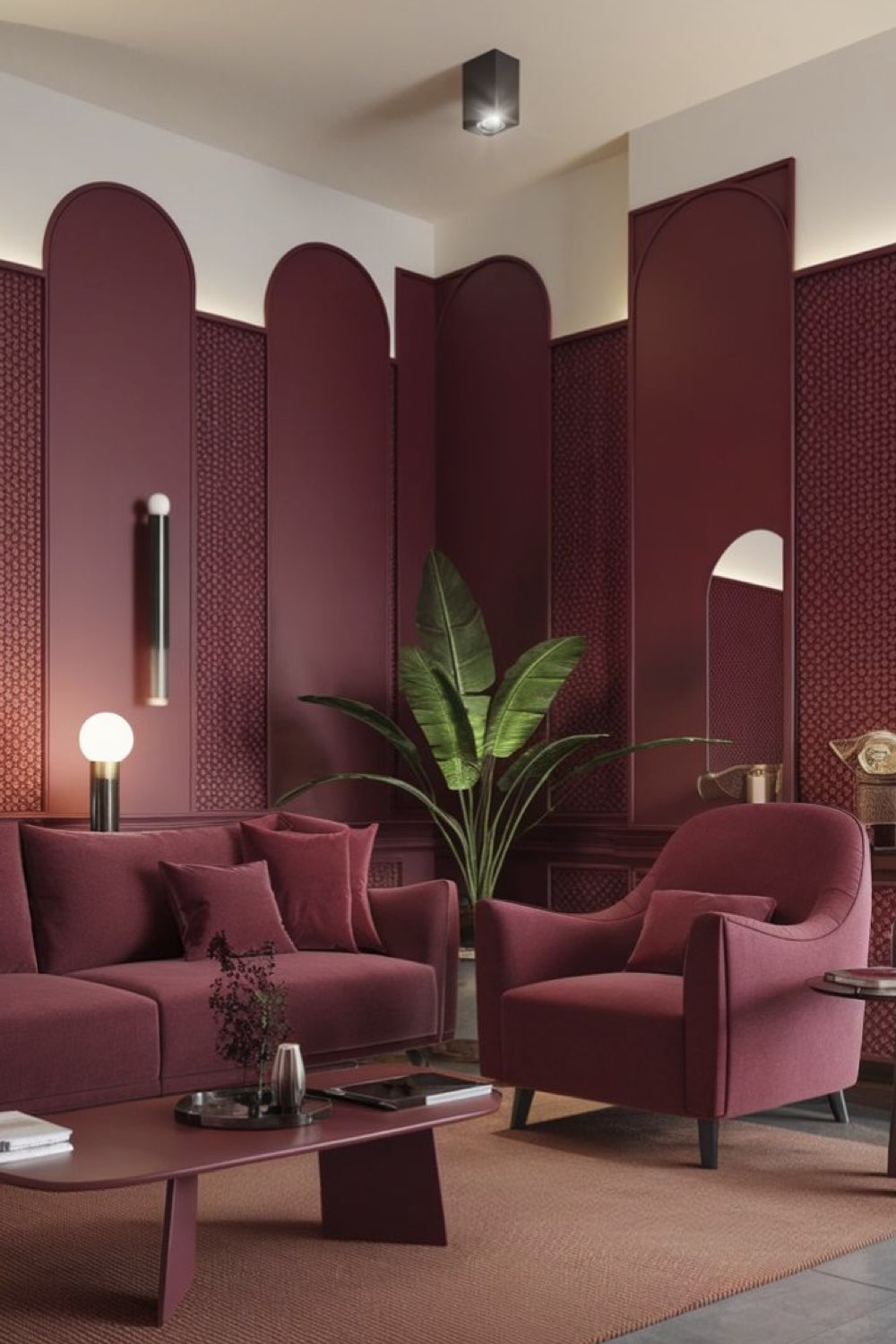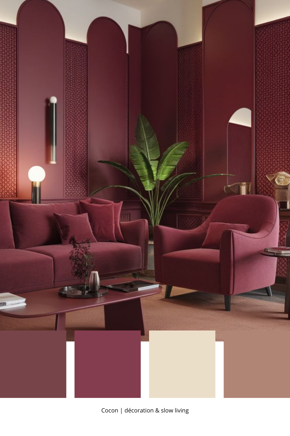 Salon bordeaux: décor mural original et meuble en ton sur ton