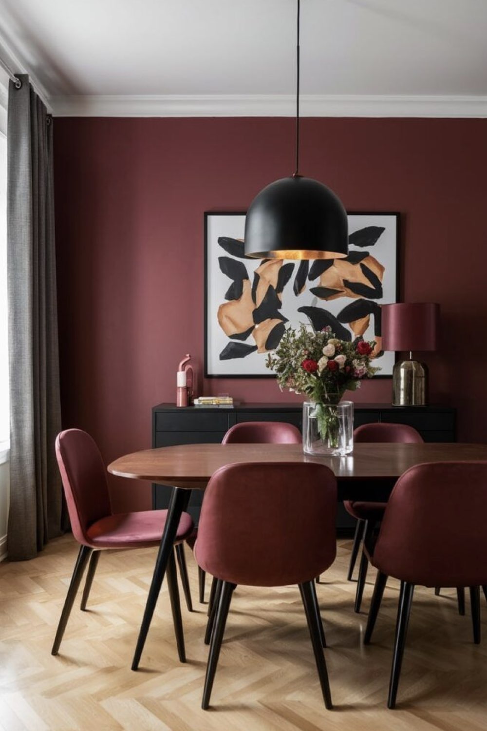 Salle à manger aux murs bordeaux, rappel de couleur grâce aux chaises