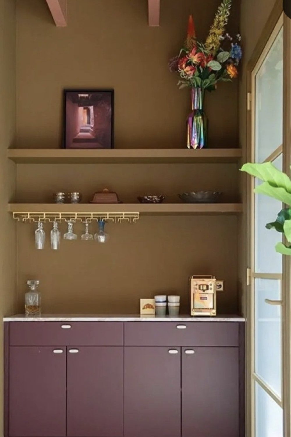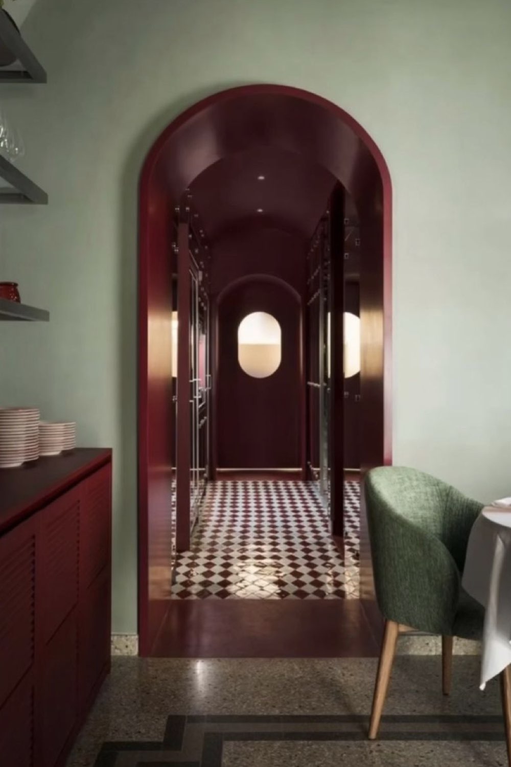 Le bordeaux est une couleur facile à vivre dans le sens où c'est une couleur qui se marie facilement avec d'autres couleurs. Les associations de couleurs avec le bordeaux sont nombreuses et vastes. Là, c'est avec un vert doux. Une nuance qui oscille entre le céladon et le vert sauge clair. Le bordeaux dans cet exemple n'est pas la couleur principale mais la couleur secondaire. Elle met en valeur différents éléments de l'espace: le meuble bas, l'arche élégante entre deux pièces.