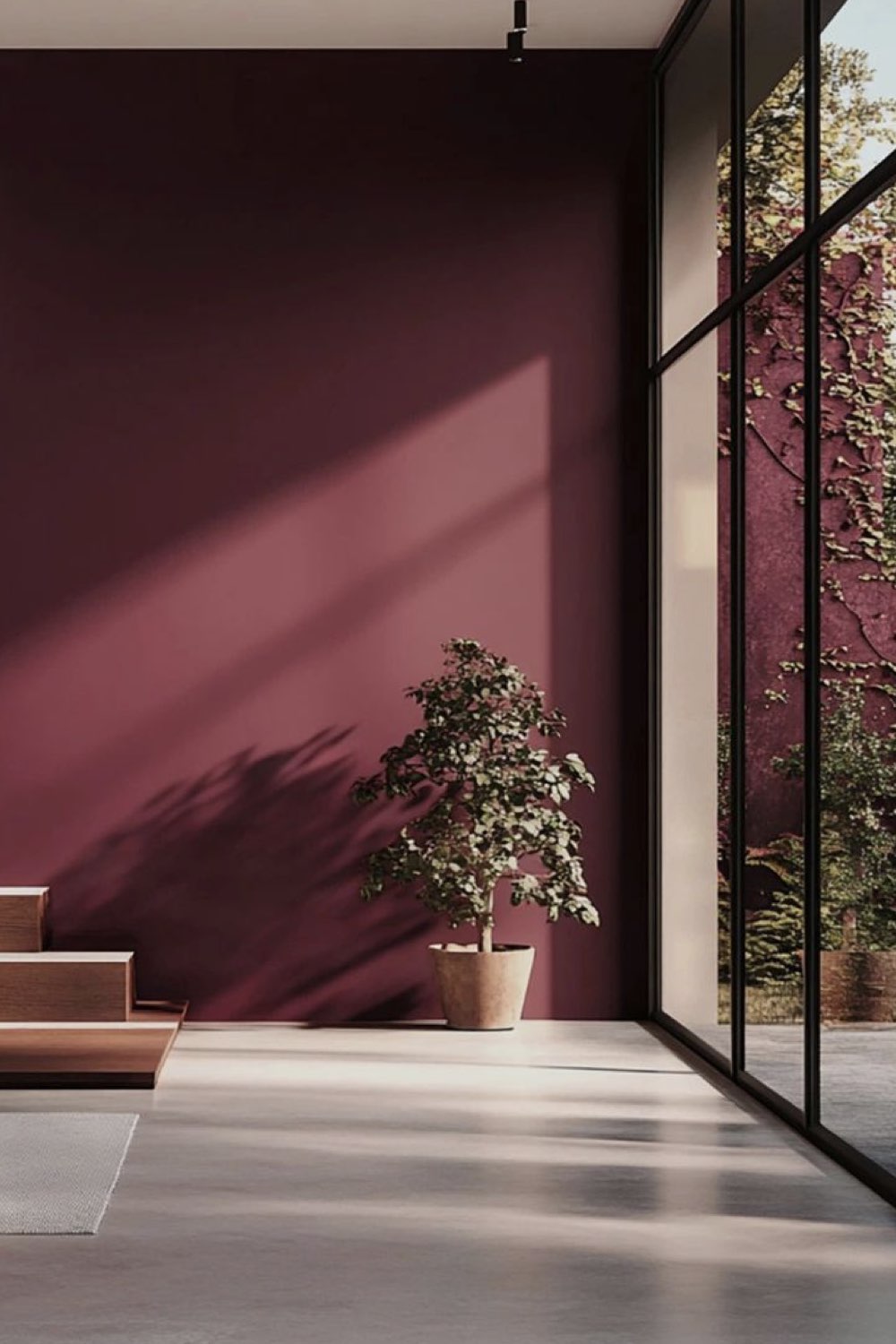 Oui, les univers minimalistes sont souvent composés de couleurs neutres. Non, ce n'est pas une vérité absolue. Le minimalisme n'exclue pas la couleur (heureusement). C'est une autre manière de l'envisager. Le minimalisme peut passer comme sur l'exemple ci-dessous: un mur uni sans accessoires déco. Un espace épuré qui laisse place à l'essentiel: la lumière, l'idée de passage, des matériaux simples mais élégants comme le béton ciré. On peut aussi regarder du côté des menuiseries de la baie vitrée: du noir, du sobre. Bref, le bordeaux contribue à l'esprit minimaliste de l'espace et le réchauffe, le rend plus chaleureux.