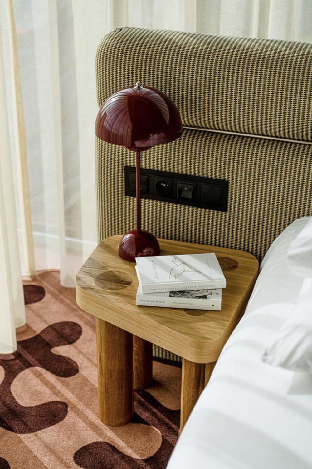 On a commencé cet article avec une chambre, on le termine de la même manière. Dans le première exemple, le soubassement était neutre et clair. Cette fois, c'est un soubassement plus foncé avec un bois sombre cannelé qui est associé à un bordeaux poudré. Une combinaison sourde, intime et élégante qui offre beaucoup de charme à la chambre à coucher.