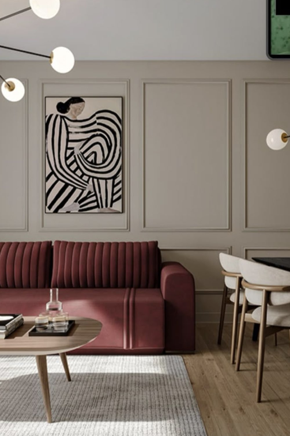 Dans cet exemple de salon, le canapé contraste avec les couleurs neutres omniprésentes. C'est le seul élément bordeaux et il conforte l'idée d'élégance moderne que l'on retrouve dans d'autres éléments de la pièce: les moulures en ton sur ton, les angles arrondis de la table basse, la structure raffinée des chaises côté salle à manger.
