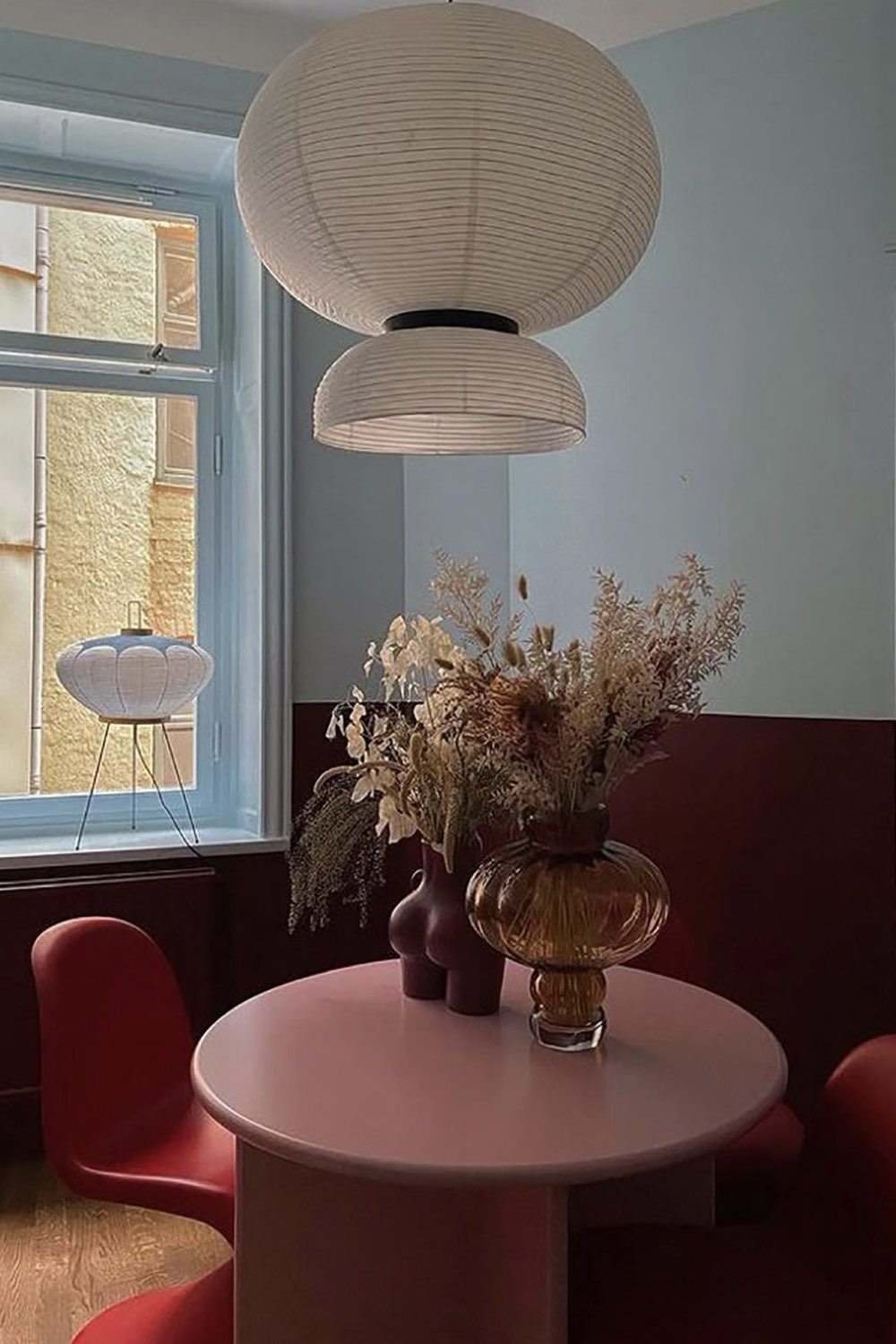A ce stade de l'article, on a déjà vu de nombreuses associations de couleurs. Et il y a encore une que je voulais vous montrer: le bleu ciel et le bordeaux. C'est un choix étonnant et je l'aime beaucoup. Ces deux couleurs forment un contraste chaud / froid. Le bleu ciel apporte aussi plus de luminosité à l'espace. C'es peut-être la combinaison de couleurs la plus audacieuse de cet article - audacieuse mais douce en même temps.