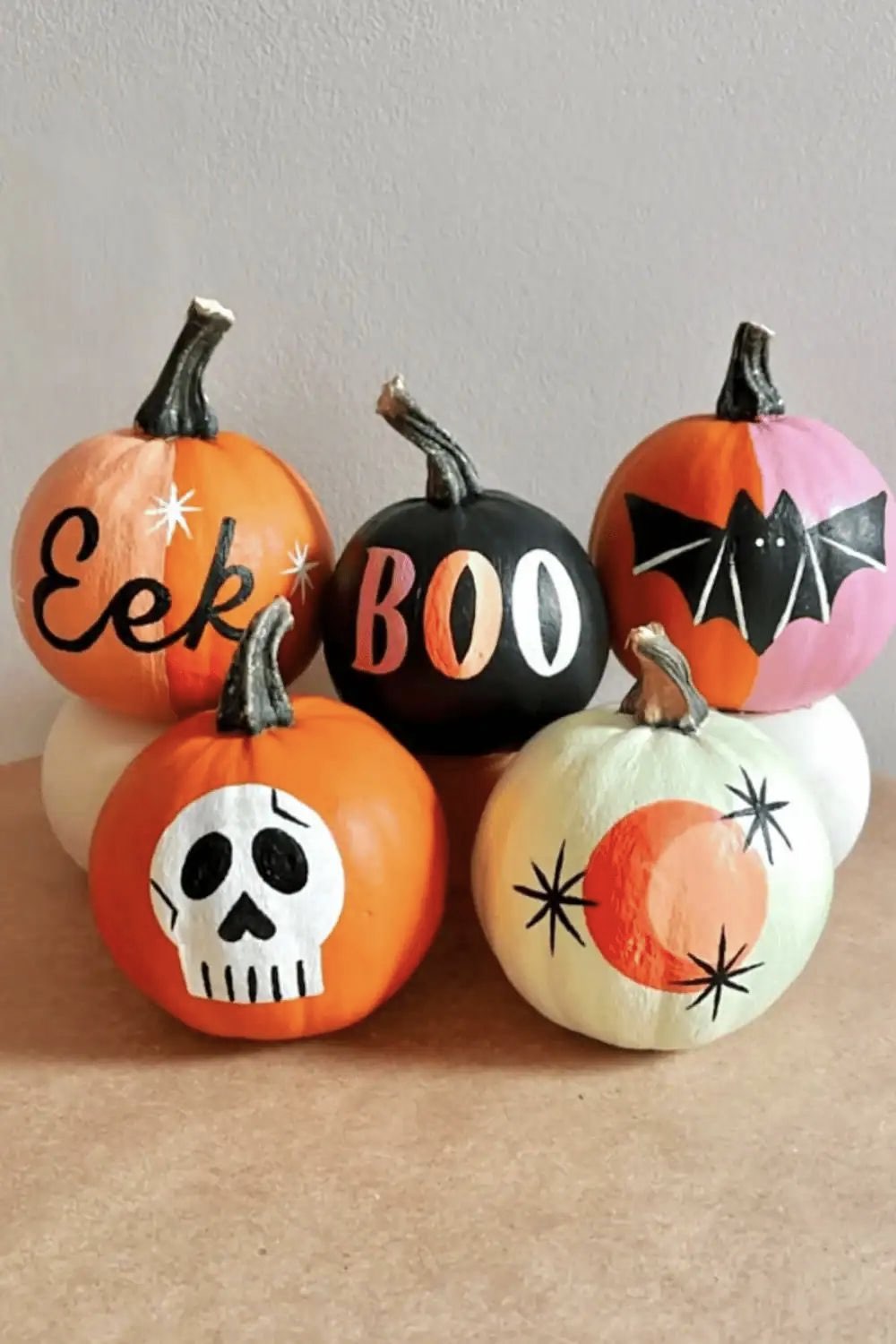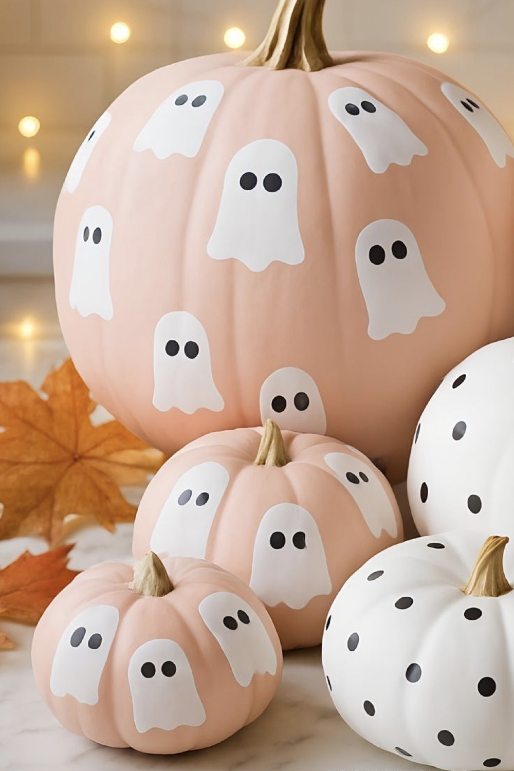 S le côté effrayant n'est pas le moteur de votre déco d'Halloween, vous aimerez peut-être cette citrouille peinte. Un fond rose tout doux, des petits fantômes mignons et simples. Pour faire les yeux, vous pouvez trempez la gomme d'un crayon de bois dans de la peinture noire et vous en servir comme un tampon.