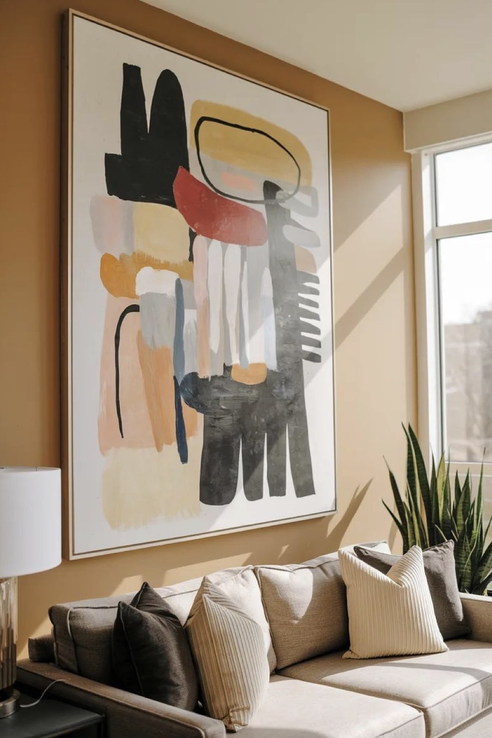 déco mur salon cadres grande affiche artistique format XXL dessus du canapé ambiance moderne