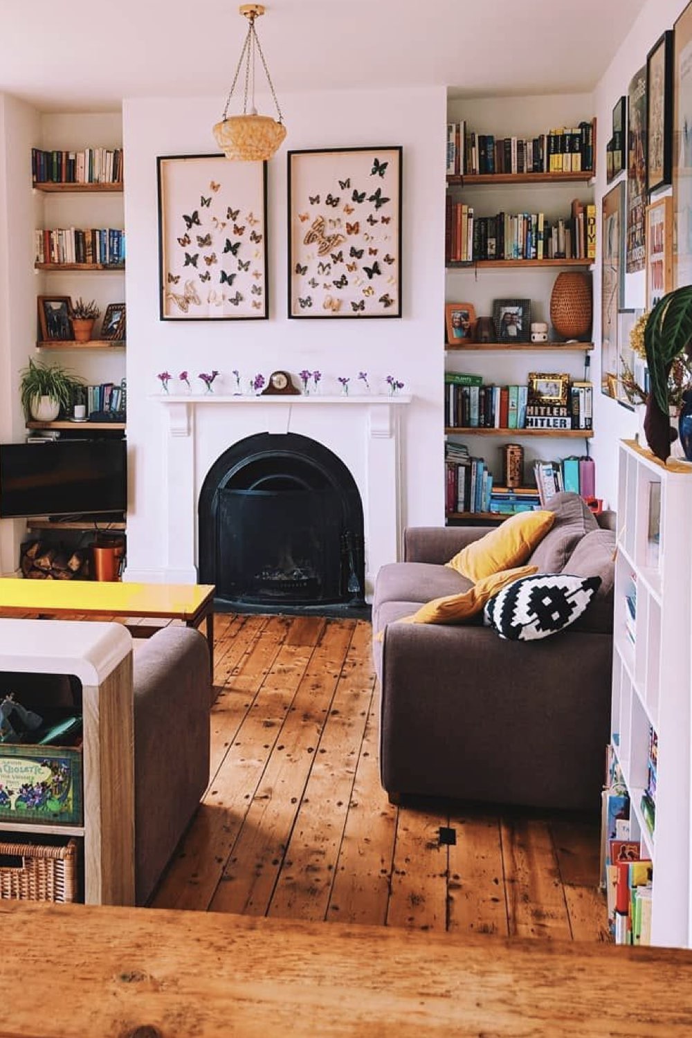 déco mur salon cadres dessus cheminée et étagère renfoncement