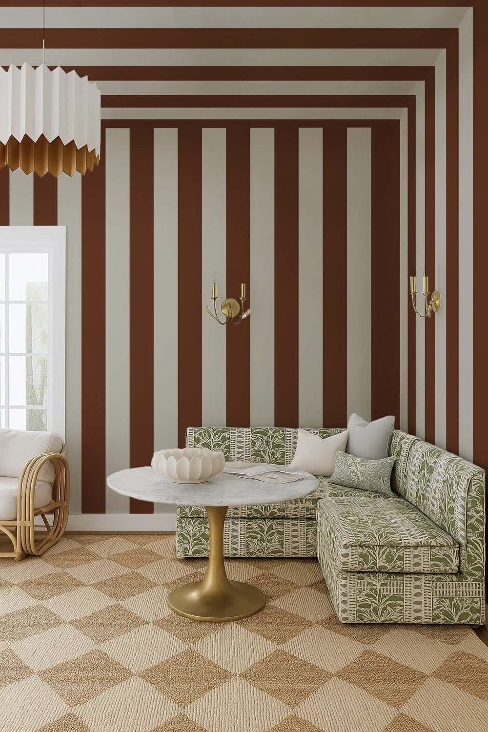 déco mur salon papier peint moderne à rayures sur tous les murs exemple canapé motif revêtement textile imprimé sol losange