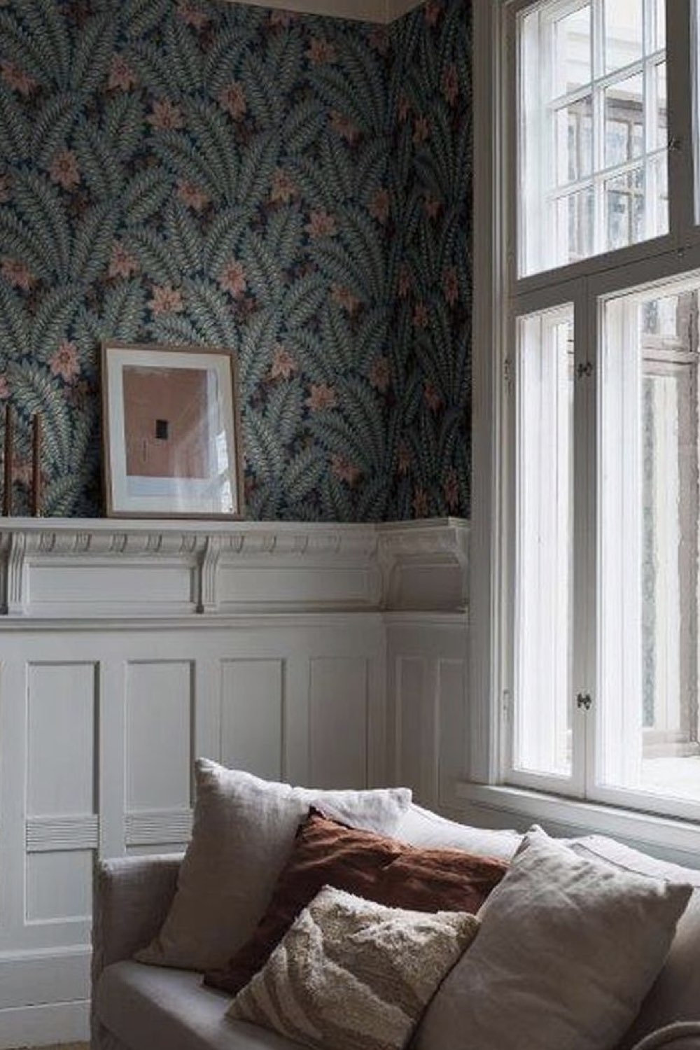 déco mur salon papier peint avec soubassement ambiance chic et élégante motif nature feuillage