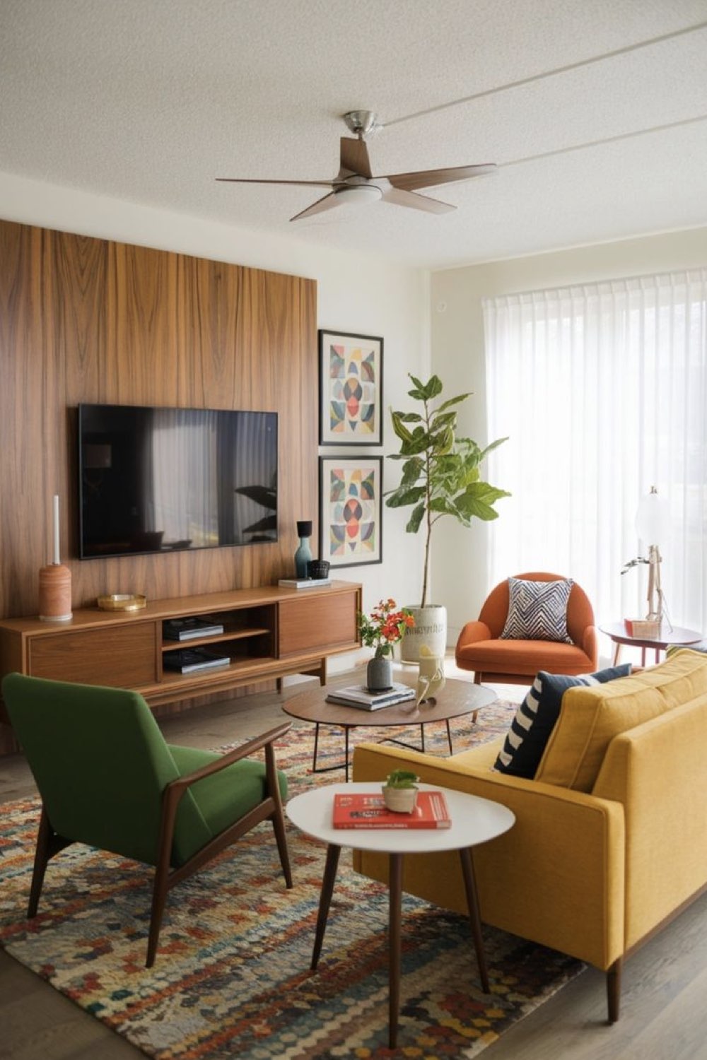 décoration murale télévision salon panneau mur bois décor chaleureux et rétro canapé jaune fauteuil vert et orange inspiration années 50