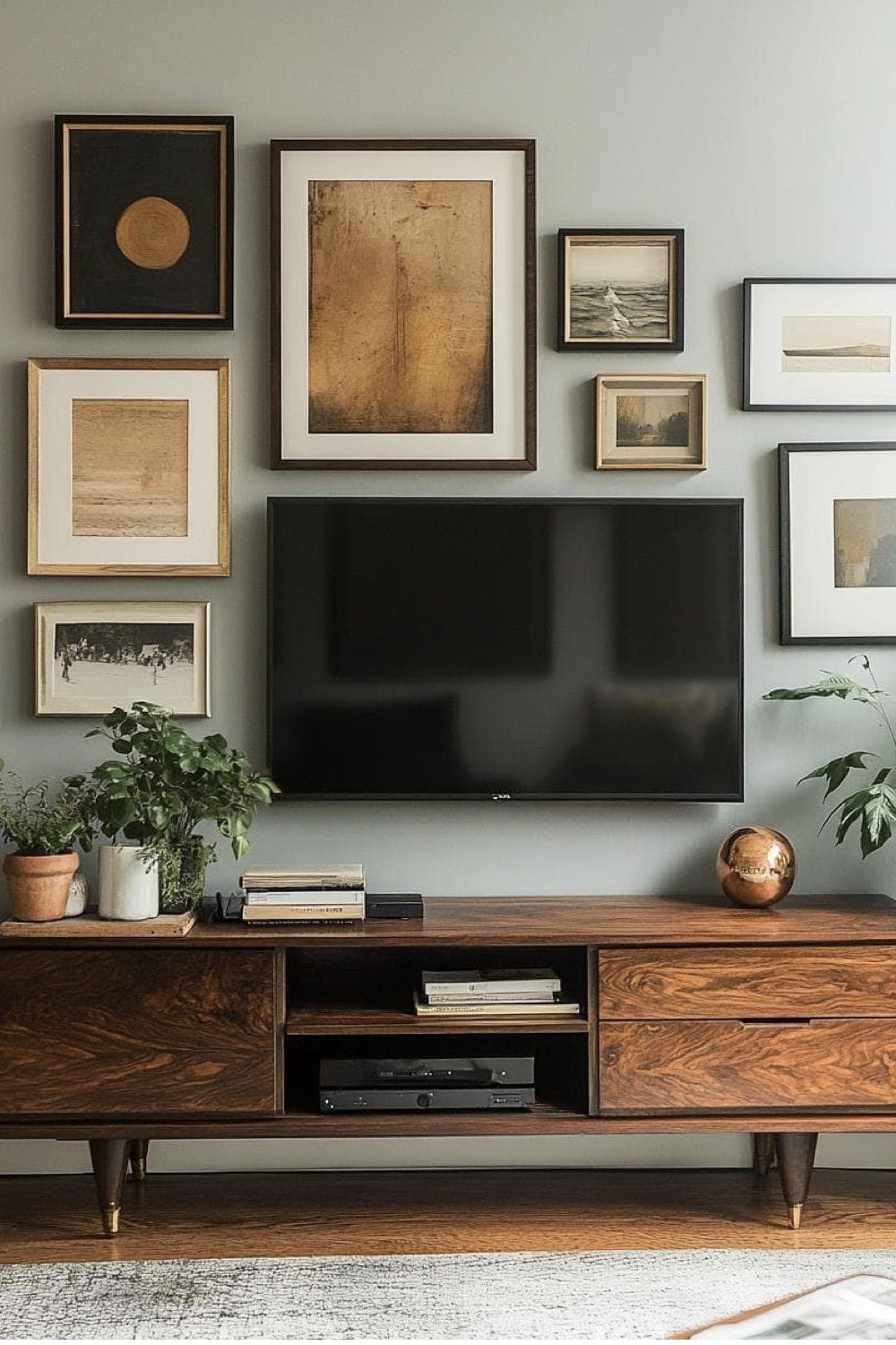 décoration murale télévision salon galerie de cadres autour de l'écran mur peinture gris