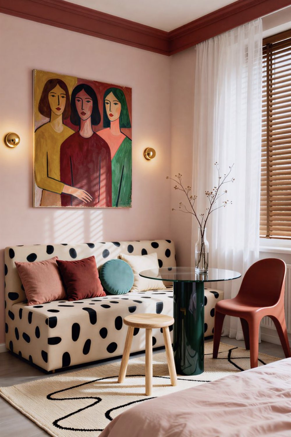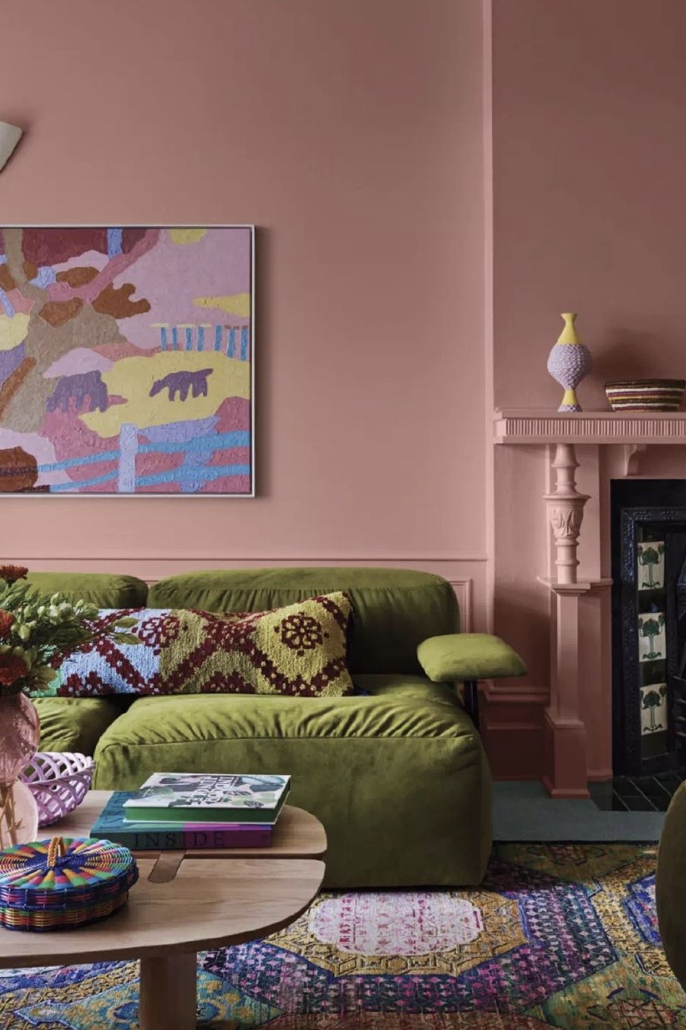 décoration murale salon peinture couleur unie rose canapé vert ambiance moderne chic