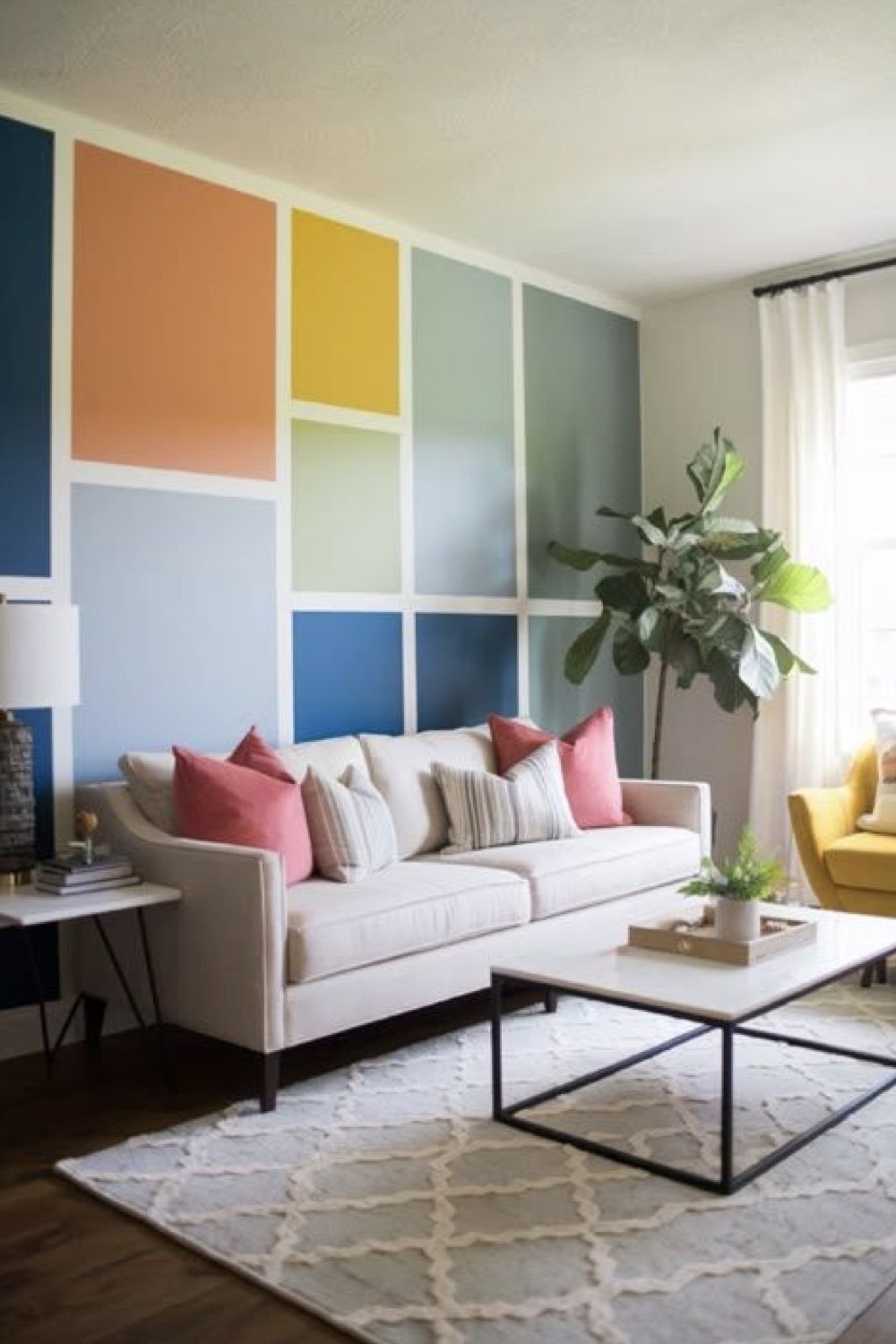 décoration murale salon peinture mur accent multicolore facile à faire idée pour mettre en valeur le canapé blanc