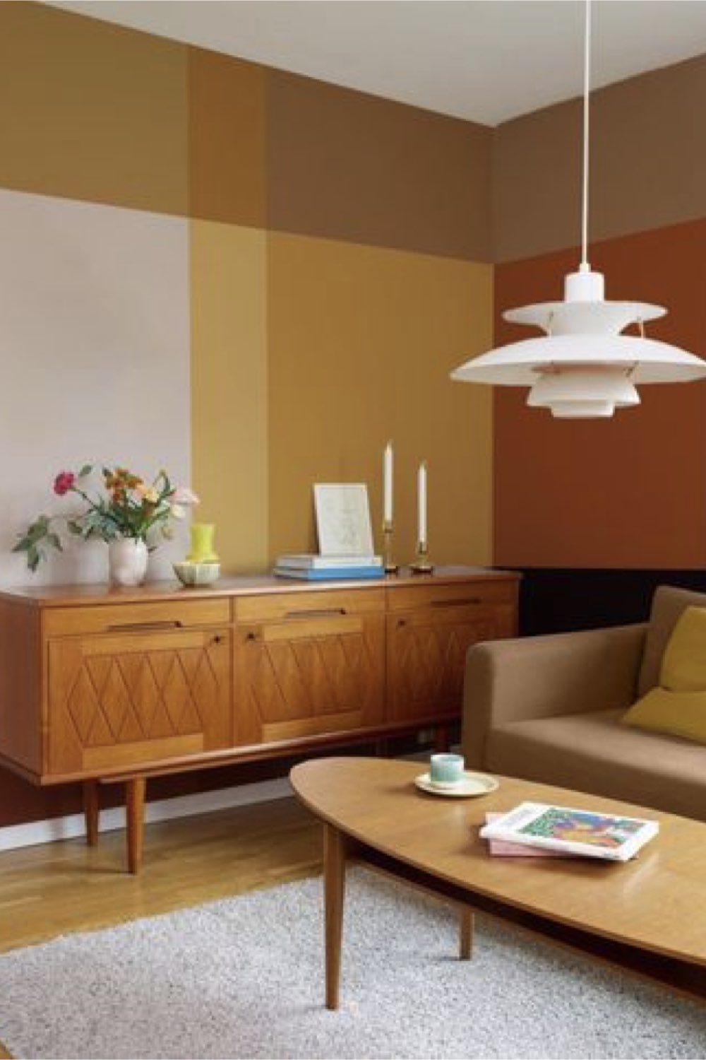 décoration murale salon peinture fresque murale motif géométriques colorés couleur chaude buffet vintage
