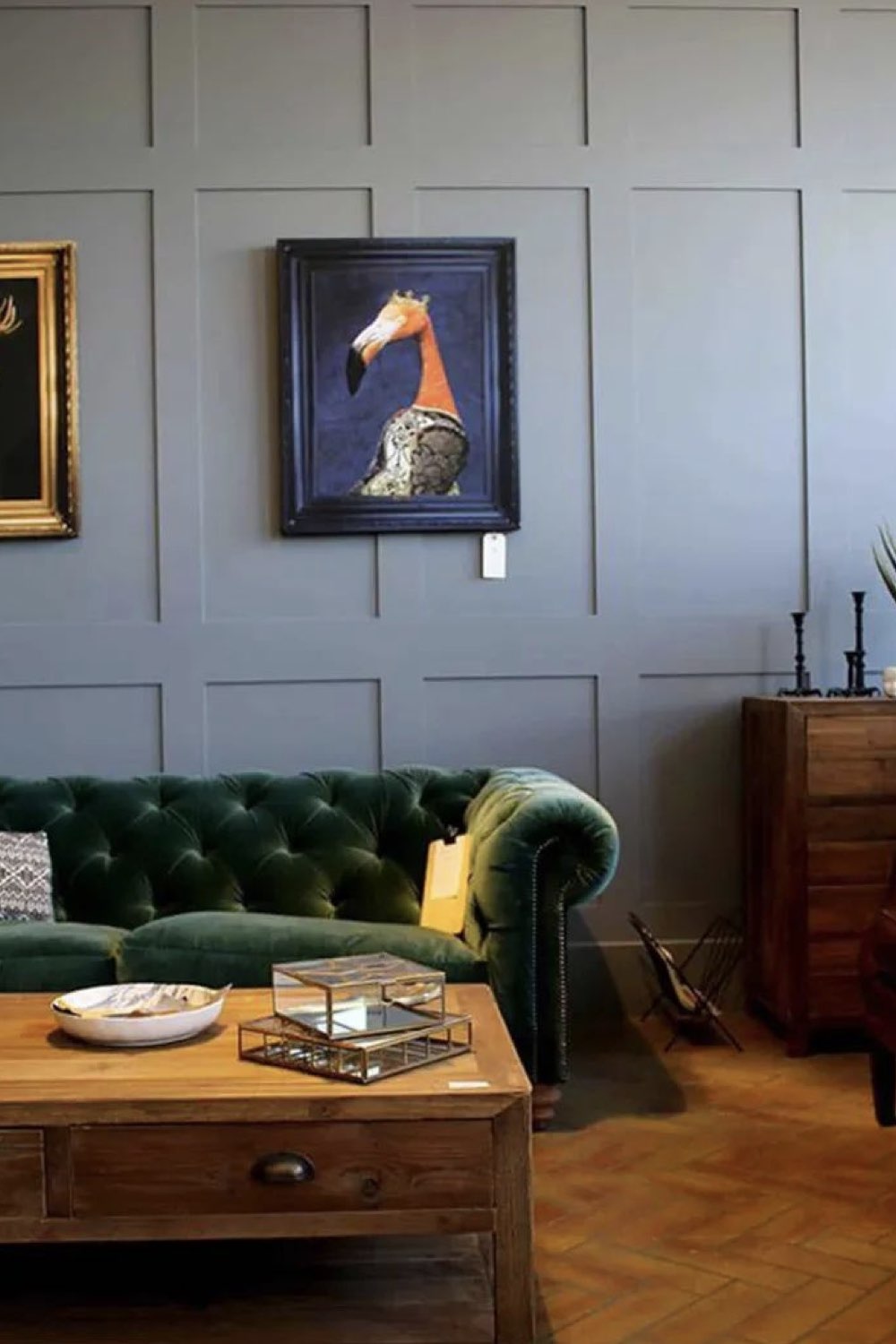 décoration murale salon peinture moulures modernes en ton sur ton canapé Chesterfiled en velours vert