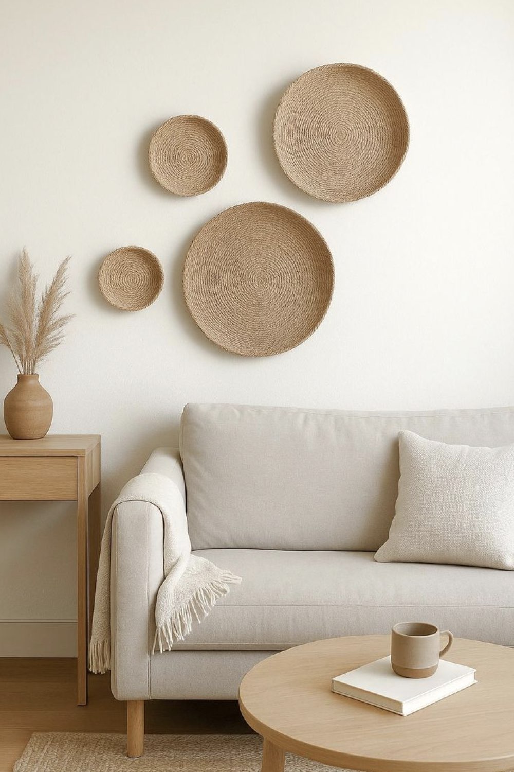 objet déco murale salon moderne fibres naturelle paniers plats accrochés au dessus du canapé