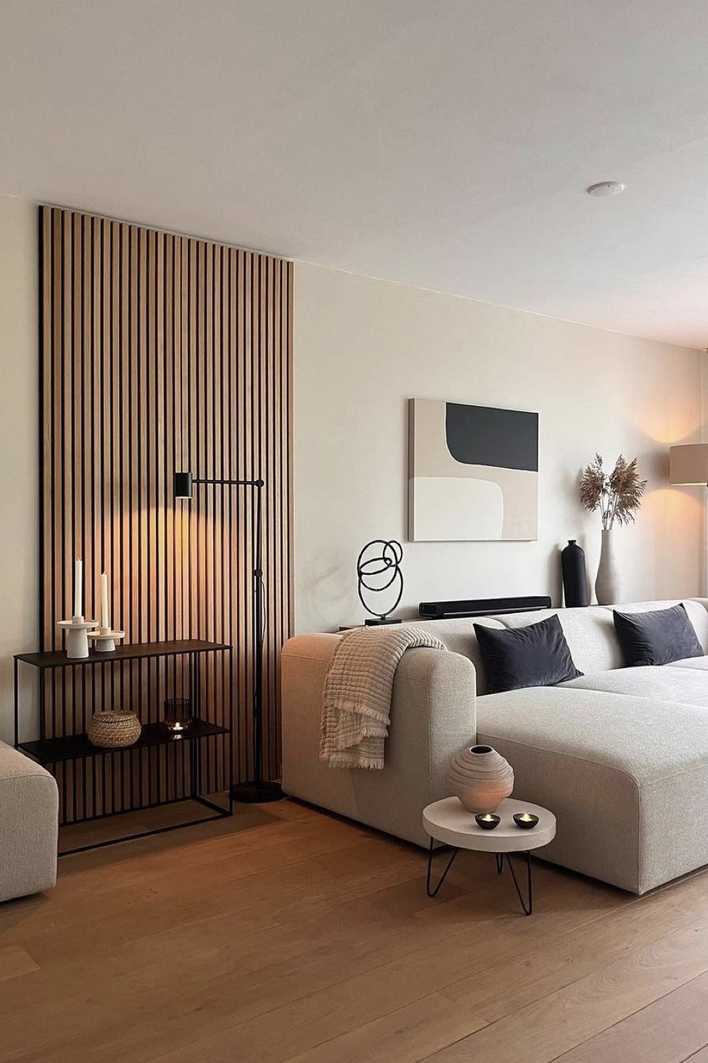 revêtement murale déco de salon tasseaux de bois ambiance moderne et chaleureuse