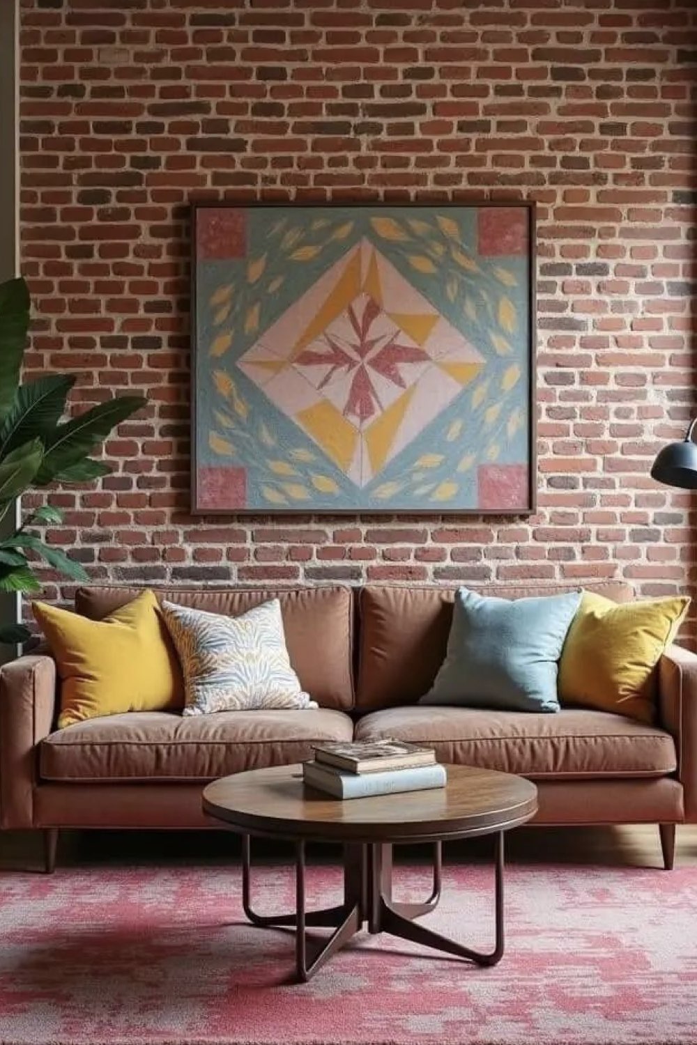 revêtement murale déco de salon mur en brique pièce de vie moderne canapé rose couleur accent jaune et bleu