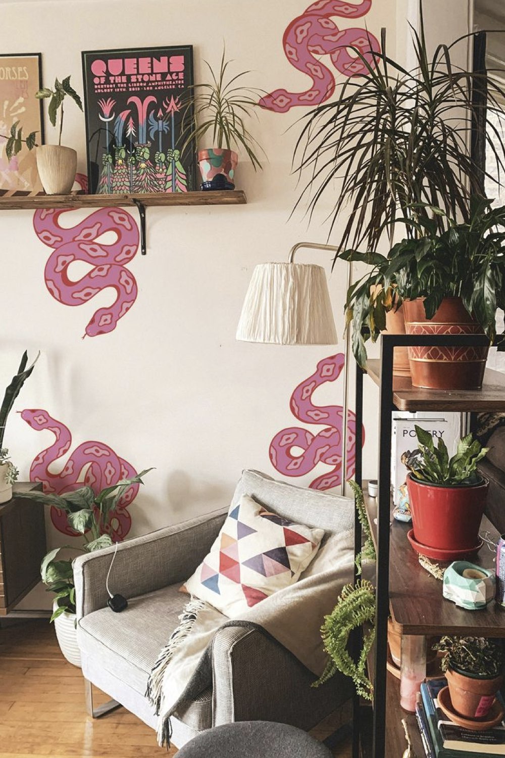 revêtement murale déco de salon stickers moderne serpent rose décoration mur originale