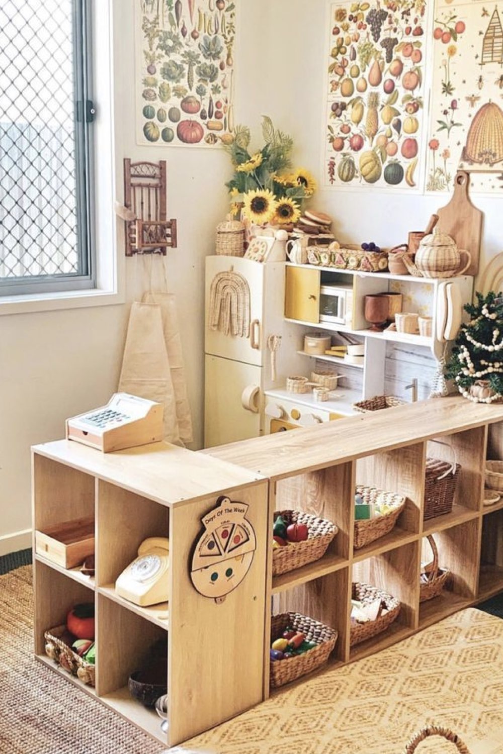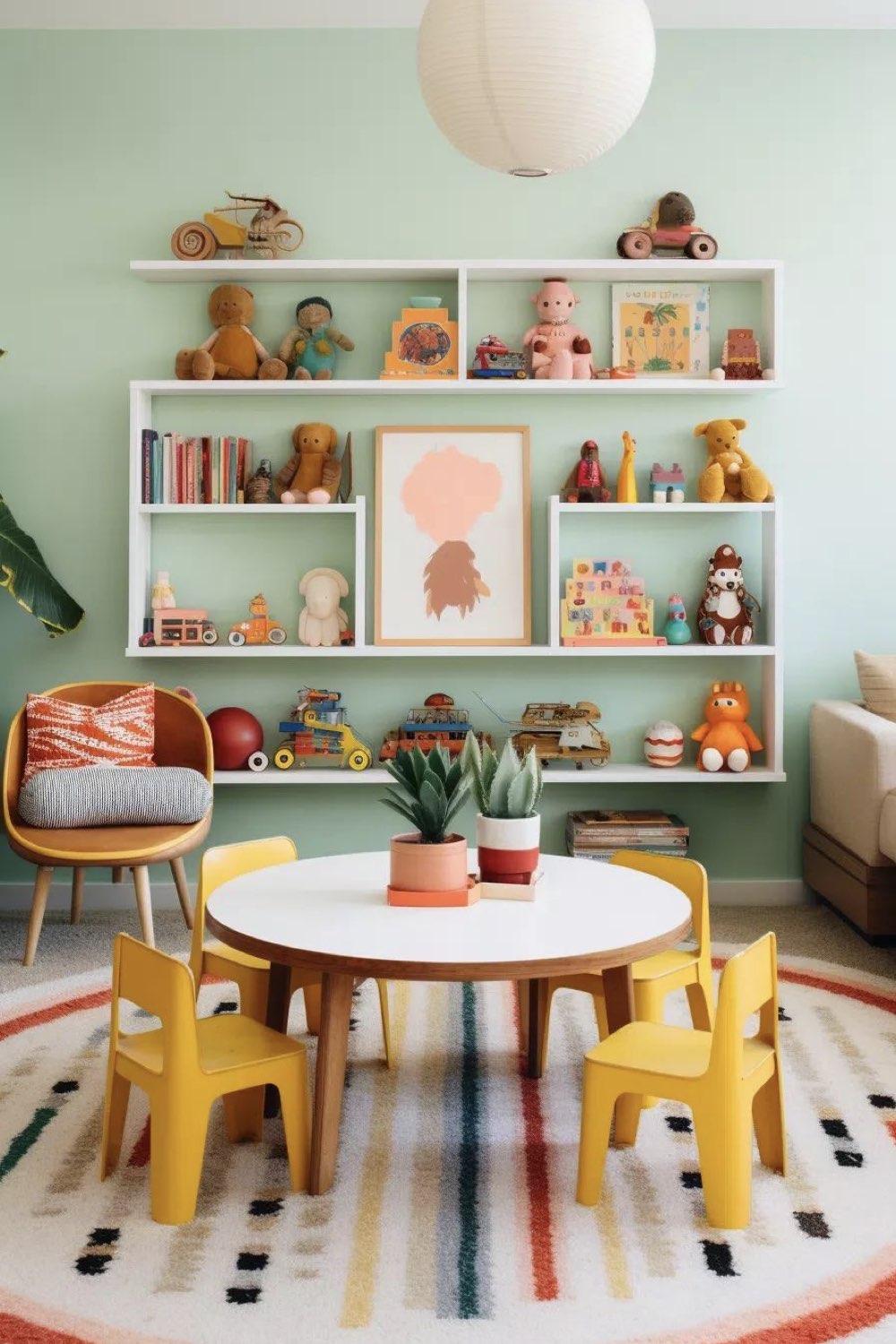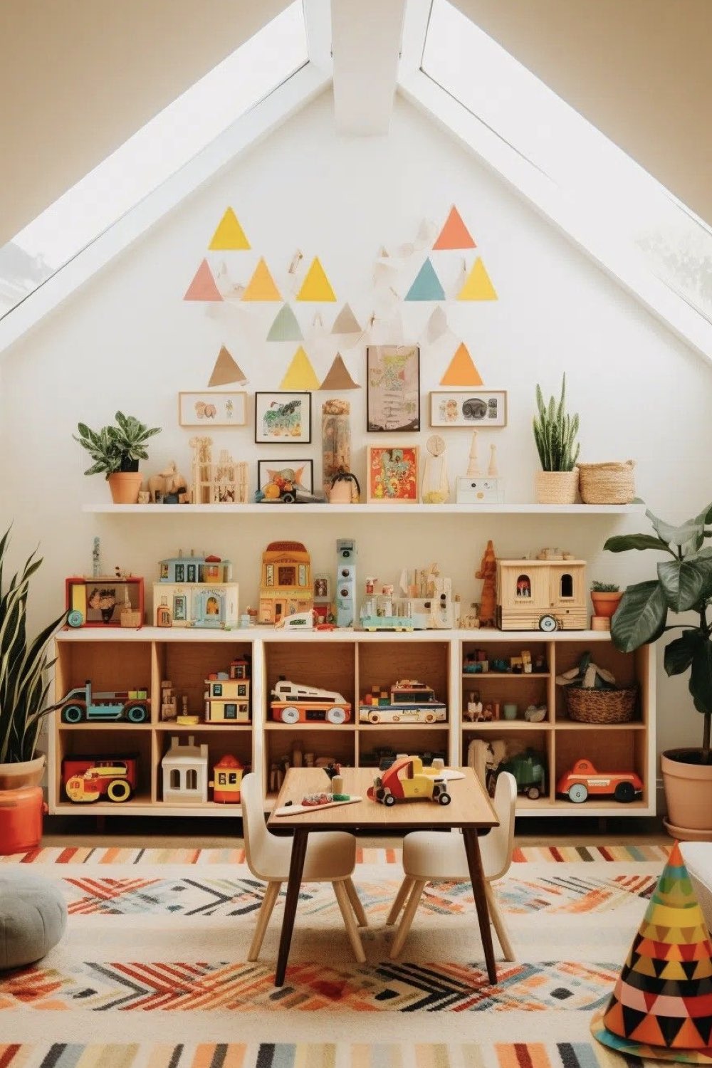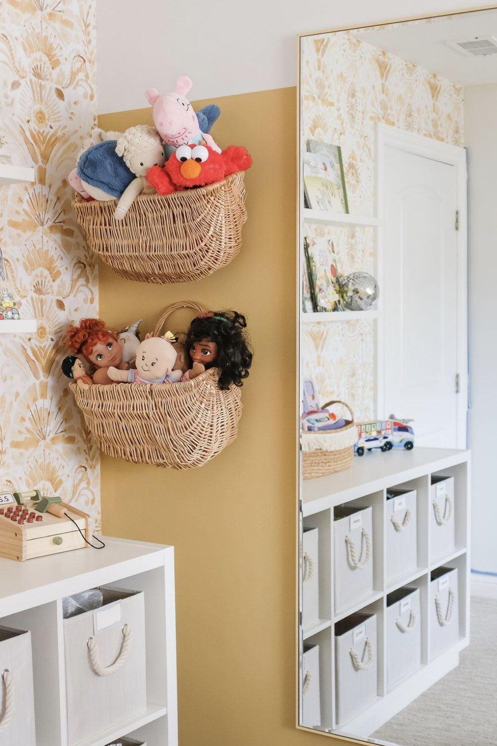 On peut penser à des rangements muraux. Etagères pour ranger les livres, paniers fixés au mur pour les peluches qui servent rarement, pegboard pour ranger les affaires de dessin ou pour ranger les outils de son atelier.