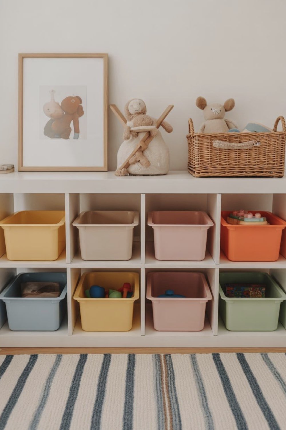 Pas de portes ou de tiroirs pour éviter de se pincer les doigts, des bacs de rangements à glisser dans un meuble sont plus pratiques. Ces bacs peuvent être une occasion de créer des touches de couleurs dans l'espace et créer une ambiance plus ludique et joyeuse.