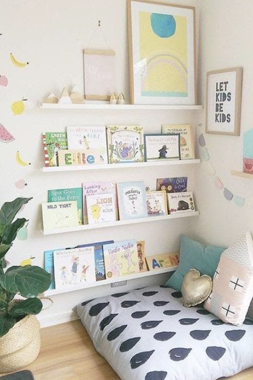 Il n'y a pas d'âge pour la lecture et la salle de jeux - même petite - peut être une bonne occasion pour installer un coin plus calme où votre kid pourra regarder ses livres. Toujours dans une optique de gain de place, je vous conseille d'installer cet espace dans un angle de la salle. Les angles sont souvent des espaces inexploités et les optimiser vous fera gagner de la place.