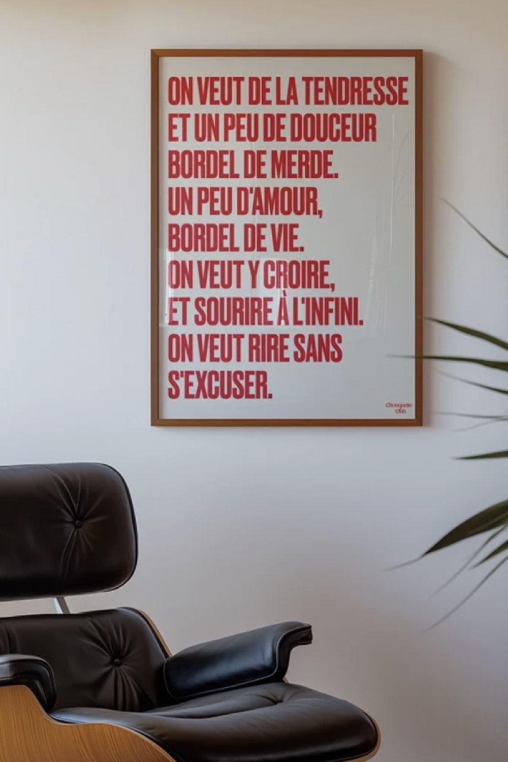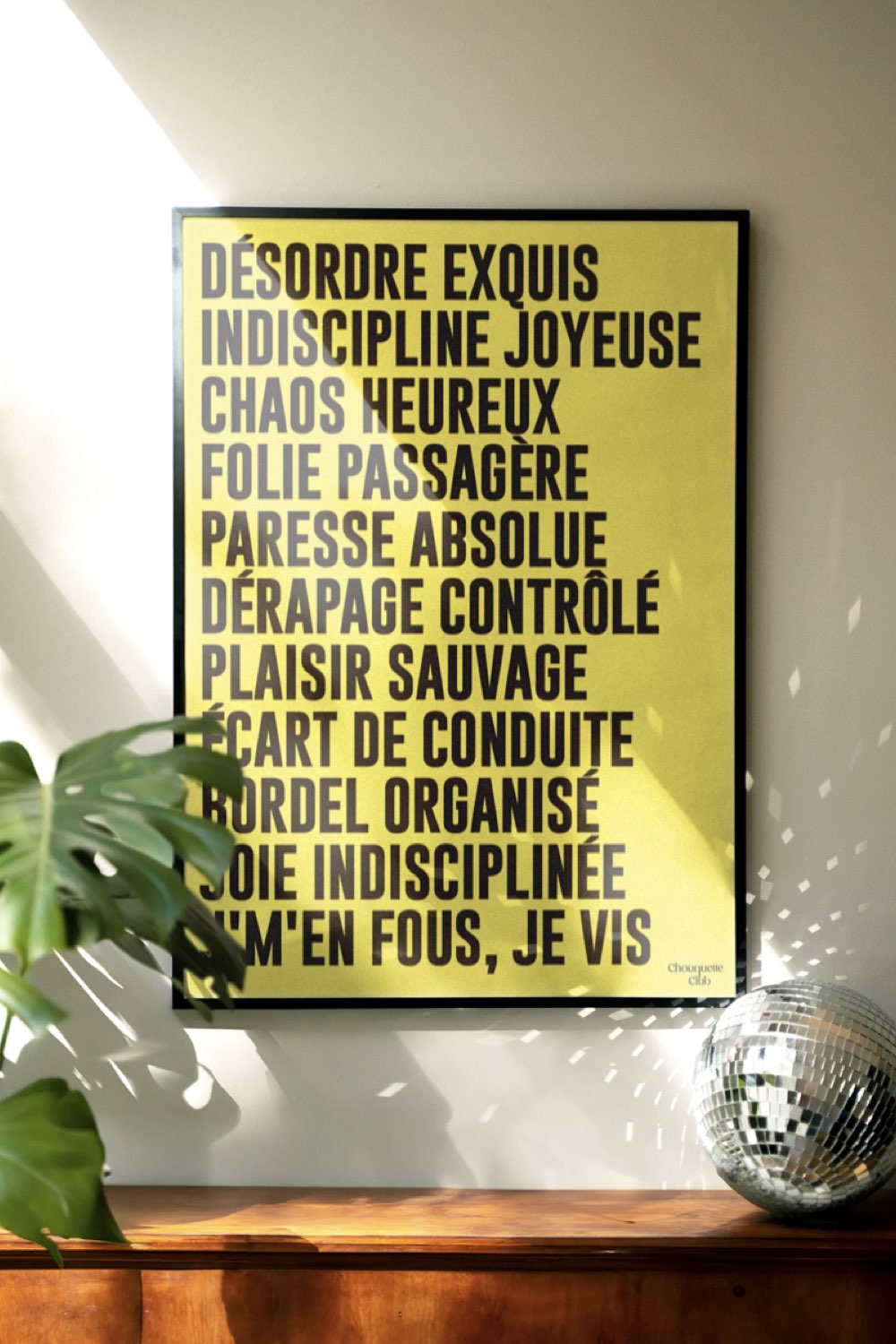 Si vous suivez le blog, vous savez que j'ai un penchant naturel pour les gros mots et tout ce qui est décalé de manière générale. J'aime aussi la couleur, les jolies typos et tout ce qui peut nous aider à personnaliser notre intérieur. Chouquette Club est un condensé de tout cela. Grâce à ses punchlines, Fanny nous permet d'apporter une petite dose de folie sur les murs et dans notre déco.