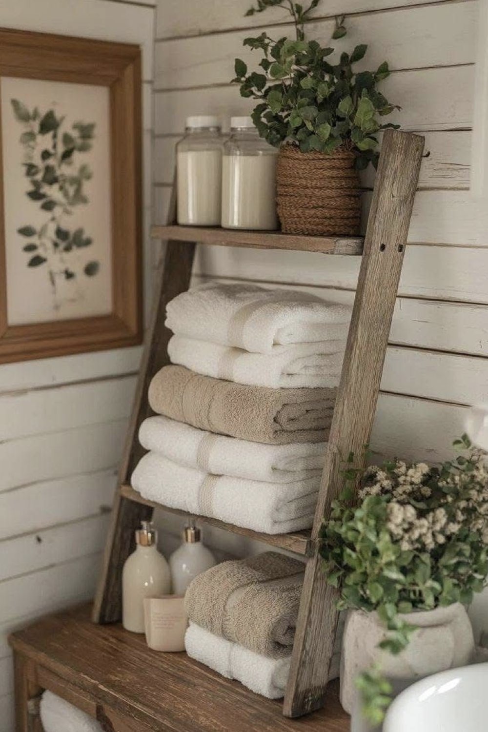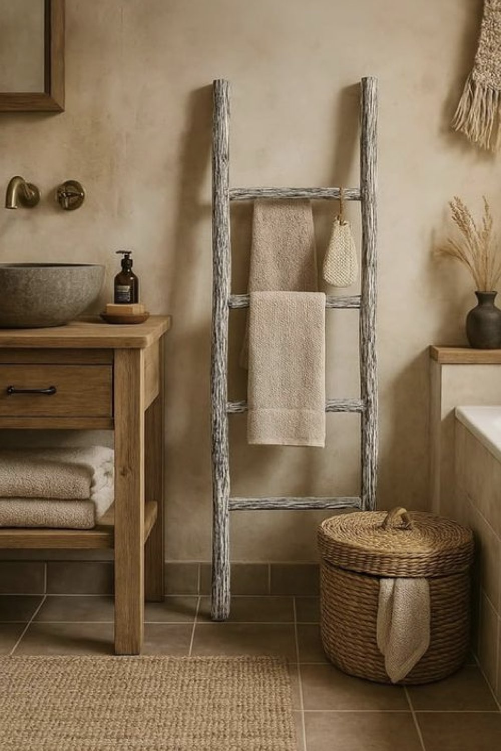 Enfin, pour le mobilier, vous pouvez être créatif•ve et faire de la récup. Le style rustique est parfait quand on aime donner une seconde vie aux objets. Comme le bois patiné, la récup' rend plus personnel et cosy votre décor. Les idées de détournements et de récup' sont nombreuses dans la salle de bain. EN voici quelques-unes: