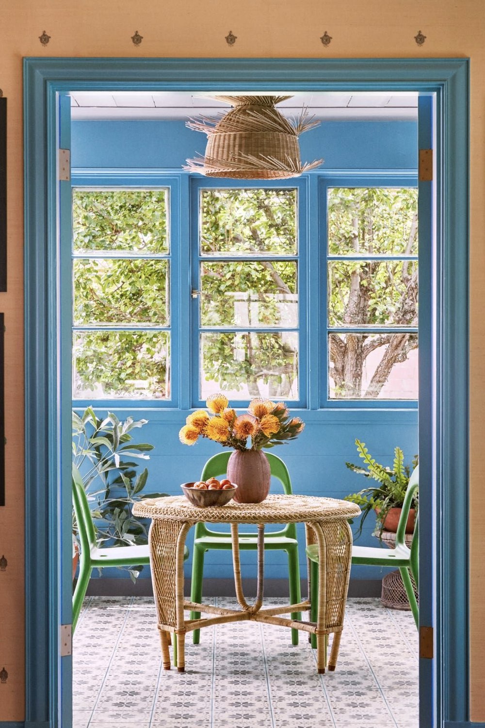 Au début de cet article, je vous ai proposé un exemple de pièces ouvertes et colorées. L'arche était petite. Cette fois, on a toujours deux pièces ouvertes l'une sur l'autre mais l'ouverture est bien plus grande. D'un côté on a une pièce à dominante jaune moutarde avec un papier peint rayé et une porte peinte en couleur. De l'autre côté, on a une pièce bleue avec les murs peintes tout comme le plafond. C'est un choix audacieux qui permet aussi l'audace de juxtaposer les deux couleurs dans un espace largement ouvert.