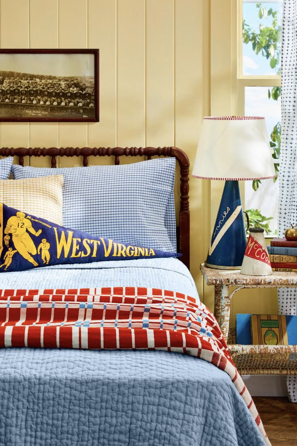 J'ai commencé cet article en vous parlant de couleurs tendances. Il y en a pas mal pour 2026 et dans tout ce choix, on trouve le bleu ciel et le jaune beurre. Des couleurs assez douces qui tirent vers le pastel. Des couleurs qui s'associent aussi très bien entre elles. Dans cette chambre d'enfant, les murs sont en lambris peint couleur Butter Yellow. Le bleu quant à lui est présent grâce aux textiles notamment la parure de lit. Des touches de bleu, de jaune plus soutenus dynamisent l'ensemble du décor. on a également une petite pointe de rouge.