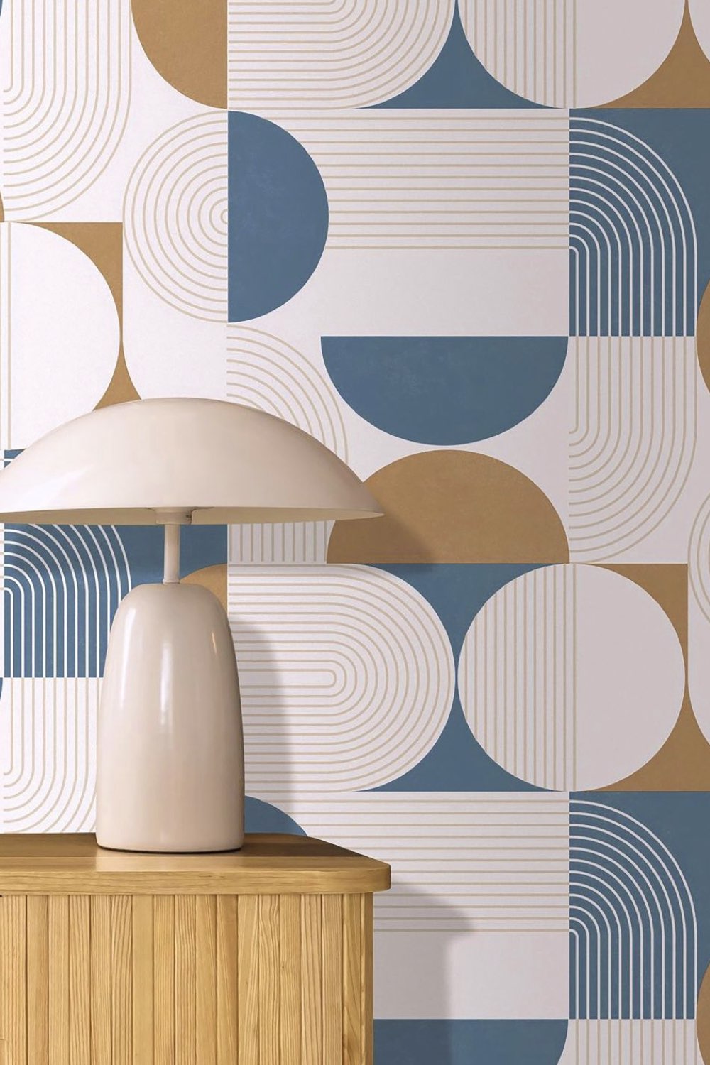 Papier peint jaune moutarde et bleu aux motifs graphiques