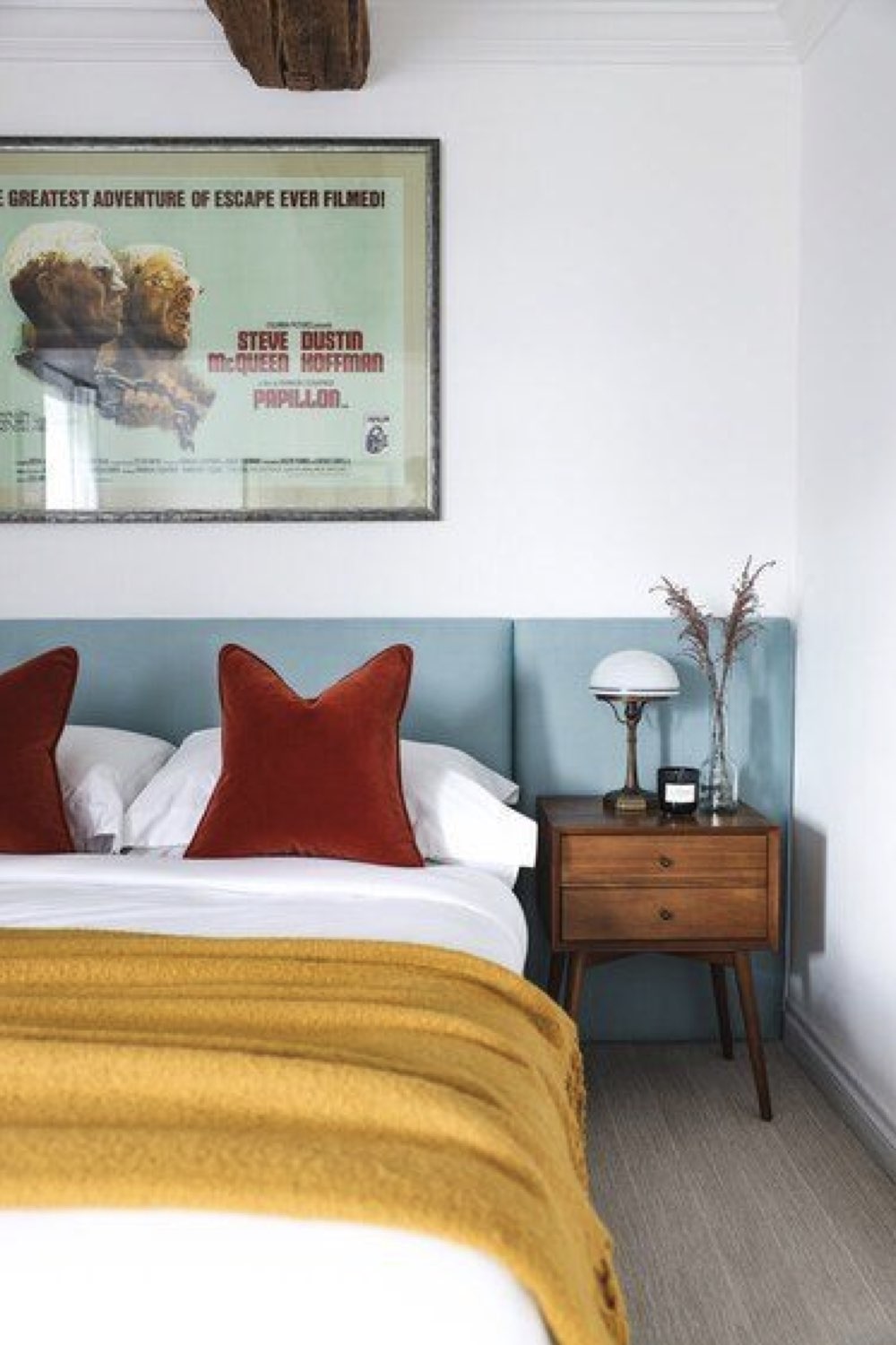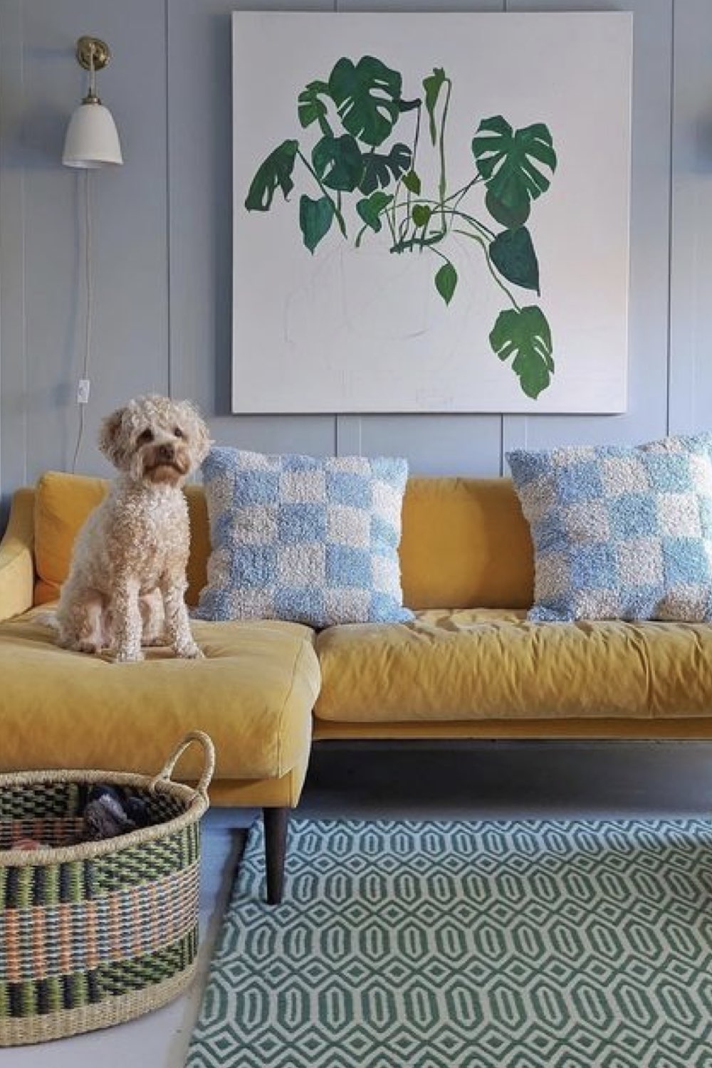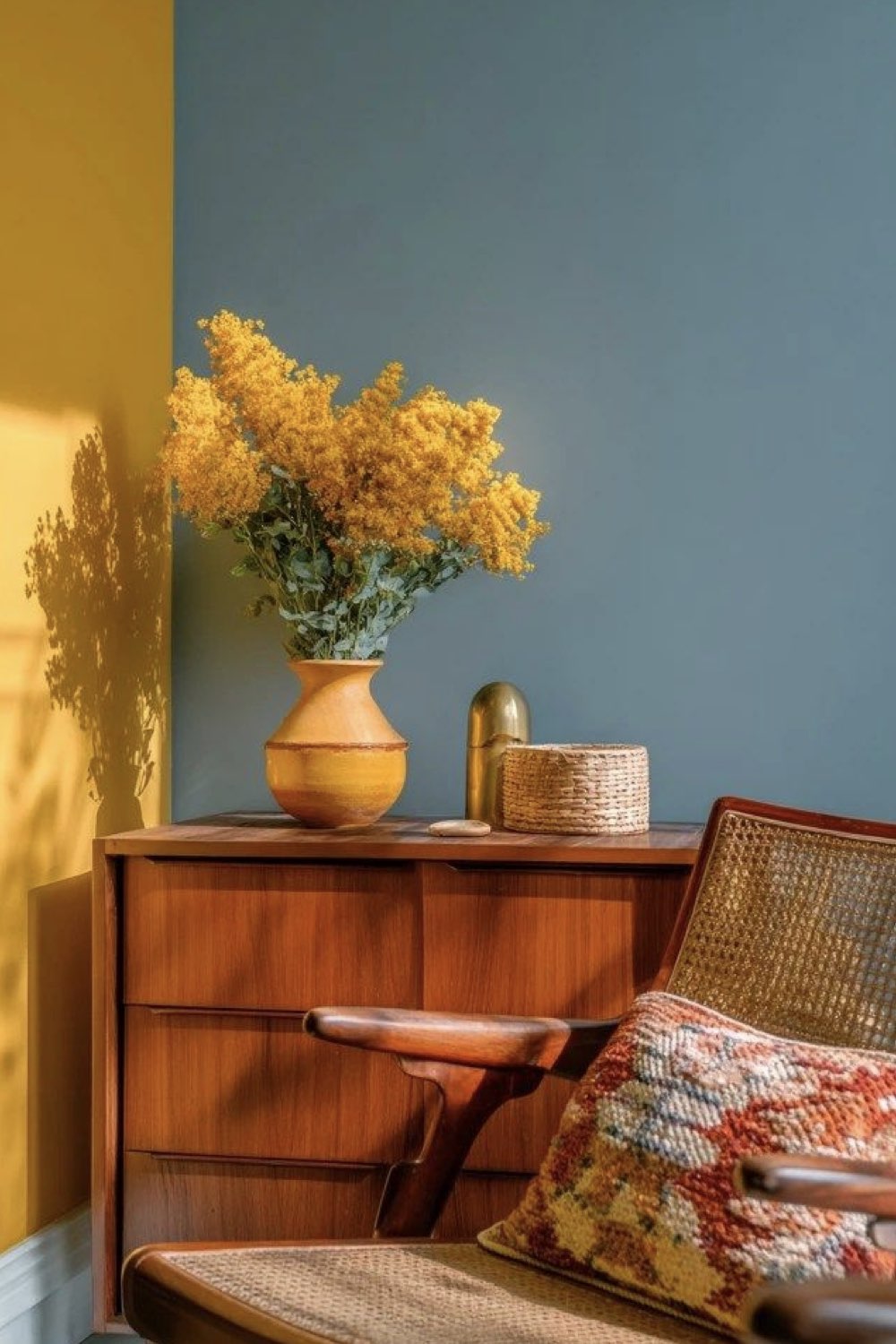 Dernière inspiration de cet article, un duo de couleurs que j'aime beaucoup. Il y a de nombreuses nuances de bleu et de jaune qui peuvent prendre vie dans votre intérieur. J'aime beaucoup le bleu grisé qui est tendre et doux à la fois. J'aime aussi la rupture visuelle entre les murs de deux couleurs différentes. Le mobilier vintage en bois foncé atténue cette rupture. Si vous aimez le style mid century modern, c'est définitivement un combo de couleurs qui peut vous aider à décorer votre espace.