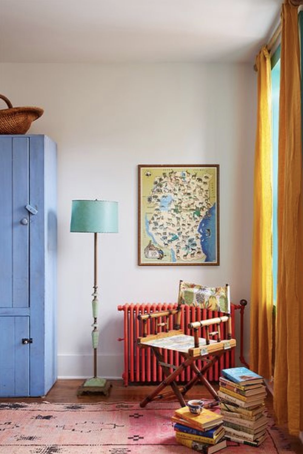 Ici, c'est une armoire qui a été peinte en bleu (un bleu ciel) et des rideaux jaunes. D'autres couleurs contribuent à l'éclectisme coloré de cet espace. L'encadrement de la fenêtre et la lampe sont en vert. Le radiateur est peint en rouge. Le tapis est dans des tonalités rose passé. Un mix de plusieurs couleurs en petite quantité ce qui évite d'avoir l'impression que la pièce est bariolée.