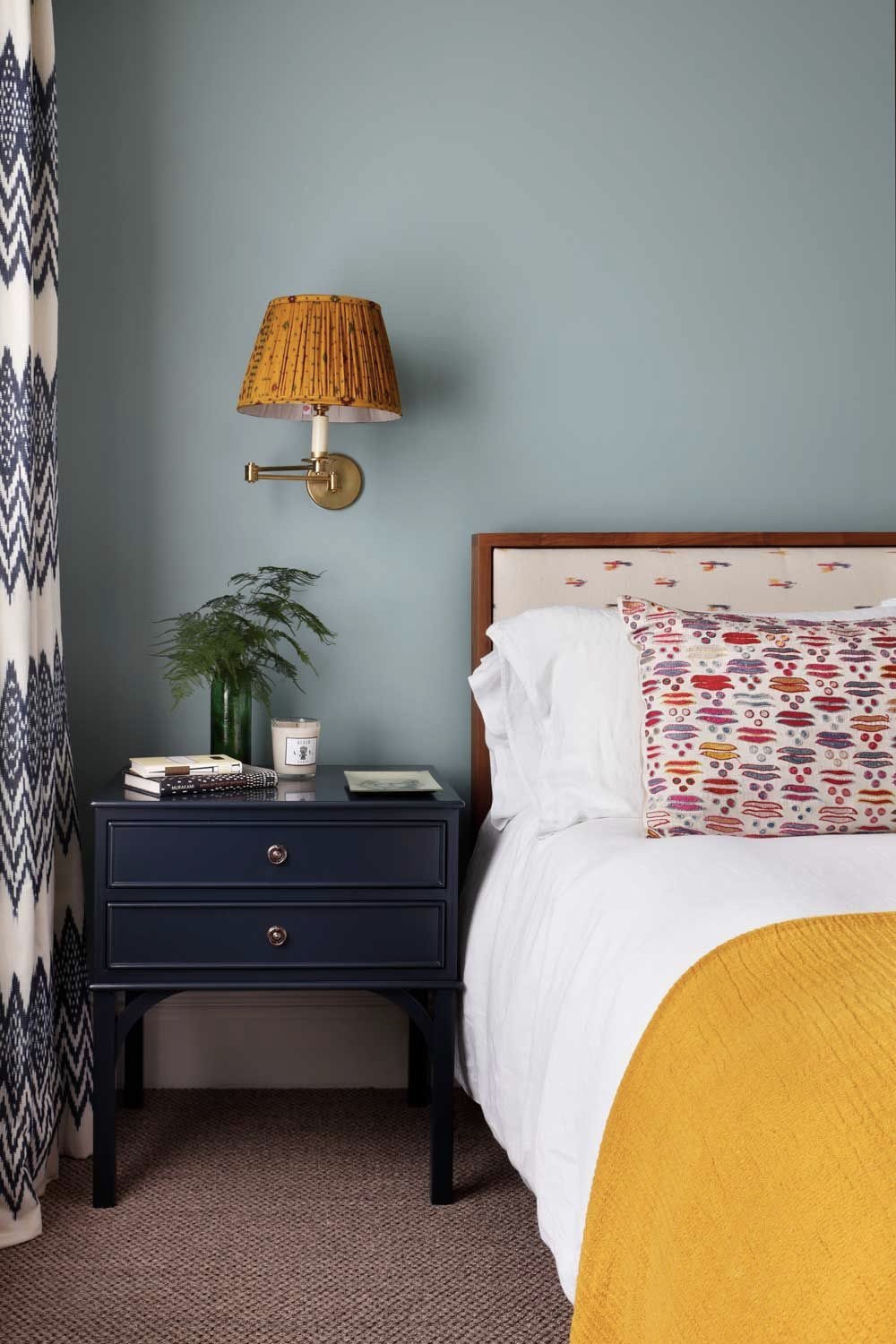 Le bleu est néanmoins de plusieurs nuances dans cette photo de chambre. On a le bleu tendre au mur. Il y a aussi une nuance plus soutenue grâce aux motifs des rideaux et à la table de chevet. Une manière de créer du relief dans l'espace. Ce relief est accentué par une couleur qui crée une rupture: le jaune. On le trouve grâce à l'abat-jour de l'applique murale mais aussi grâce au couvre-lit.
