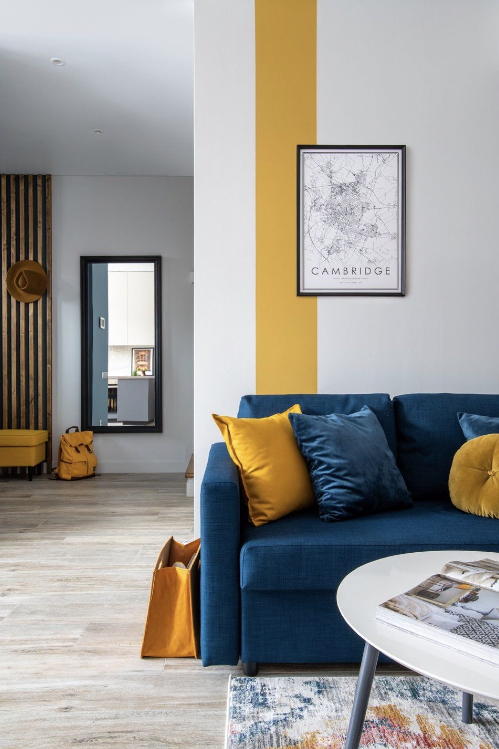 Papier peint rayé jaune moutarde et salon bleu