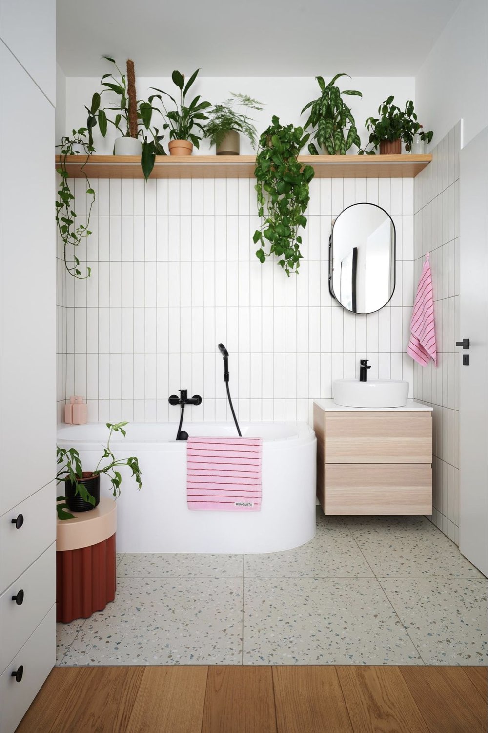Tapis et serviettes de bain colorés pour réchauffer une salle de bain blanche