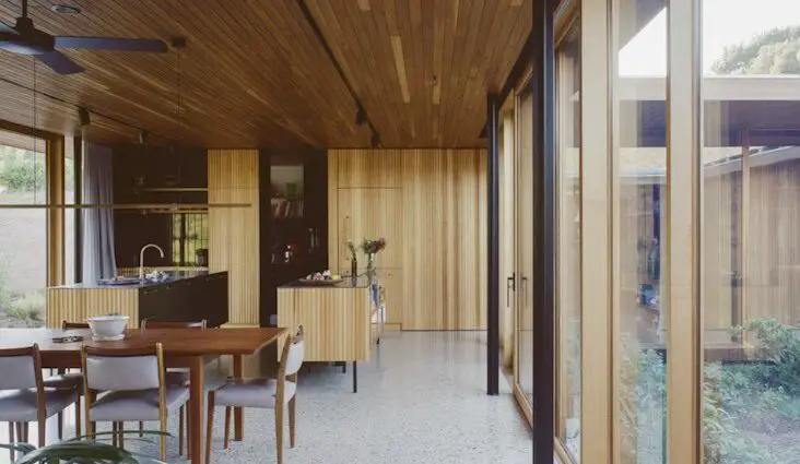 visite deco maison neuve familiale bois et baie vitree grande pièce de vie profiter du jardin patio intérieur