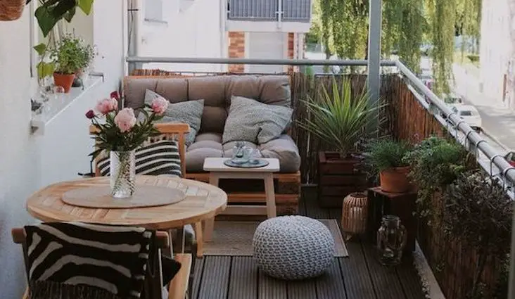 amenagement petit balcon confortable exemple canape palette petite table 2 personnes couleurs neutres et douces