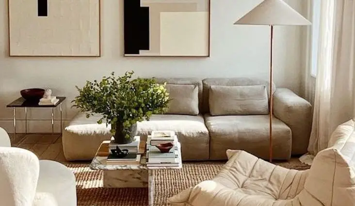 interieur minimal et chaleureux exemple salon séjour canapé fauteuil couleur neutre tableaux abstrait luminaire tapis simplicité épuré