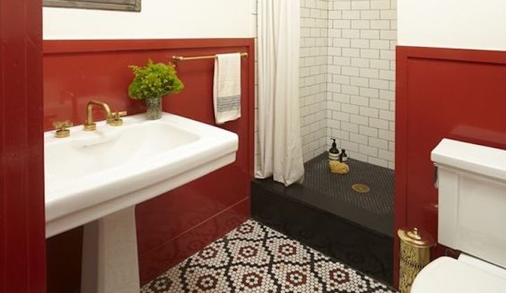 [Happy Small Living] Une petite salle de bain élégante en rouge, blanc, noir